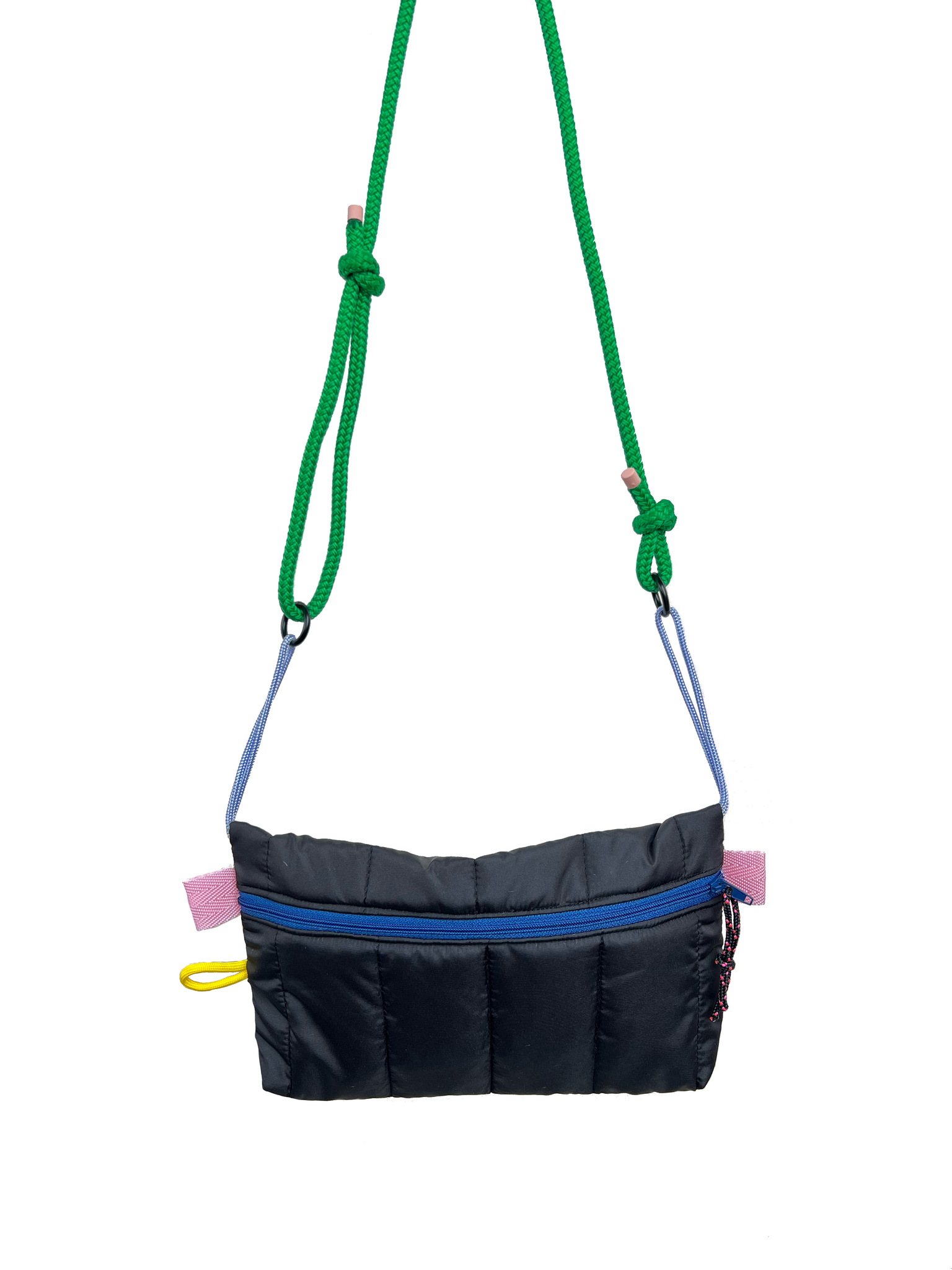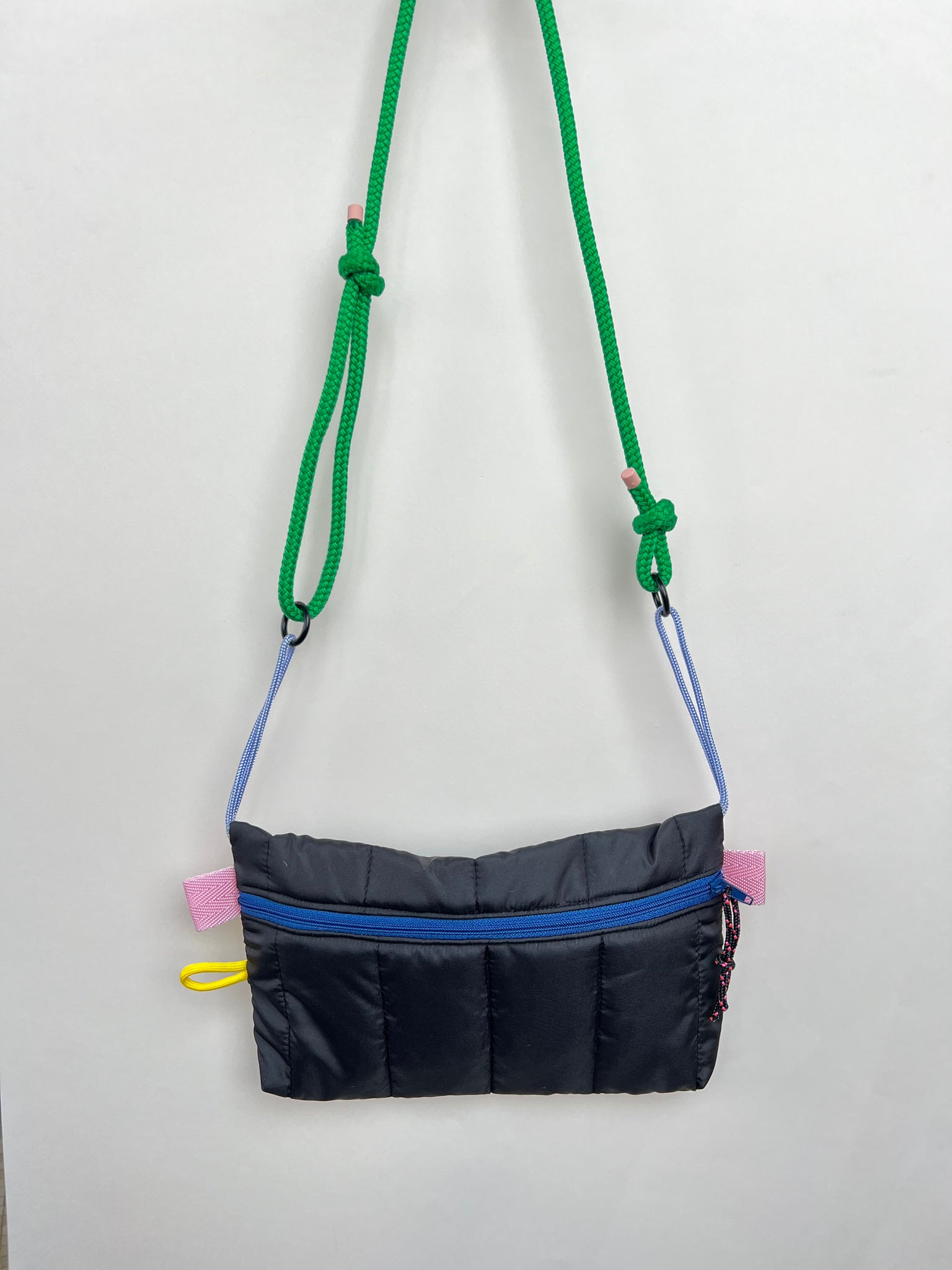 La corde bandoulière est réglable grâce aux noeuds coulissants de chaque coté.