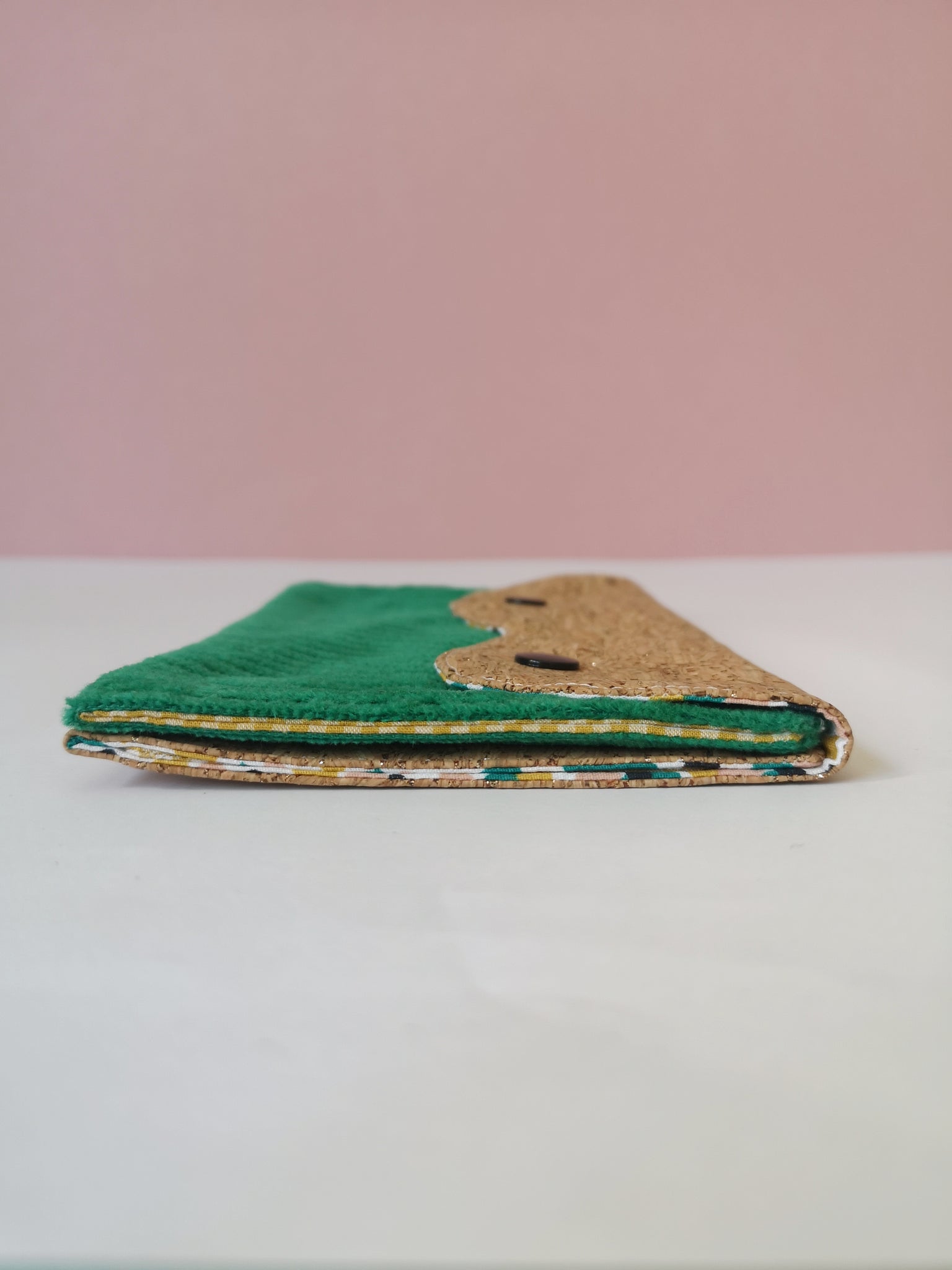A practical and compact wallet, made of velvet and real cork, lined with cotton.